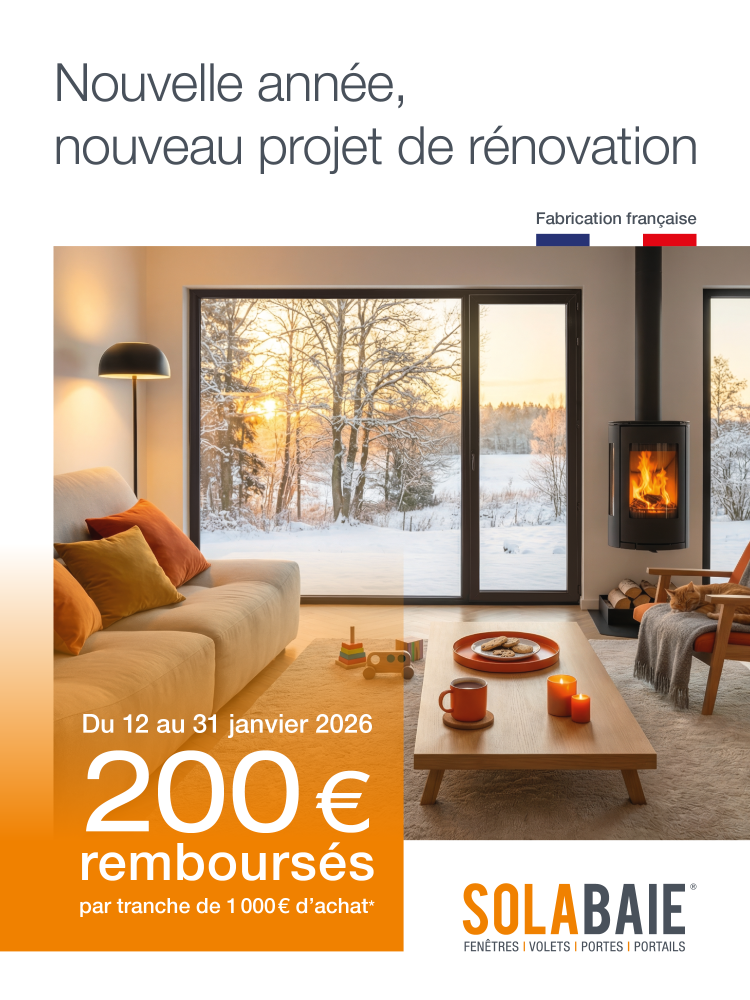 Pour bien démarrer l'année, profitez de notre offre spéciale rentrée chez SOLABAIE BORDEAUX RENOVISOL 33 : Du 12 au 31 Janvier 2026 profitez de 200€ remboursés par tranche de 1000€ d'achat! *